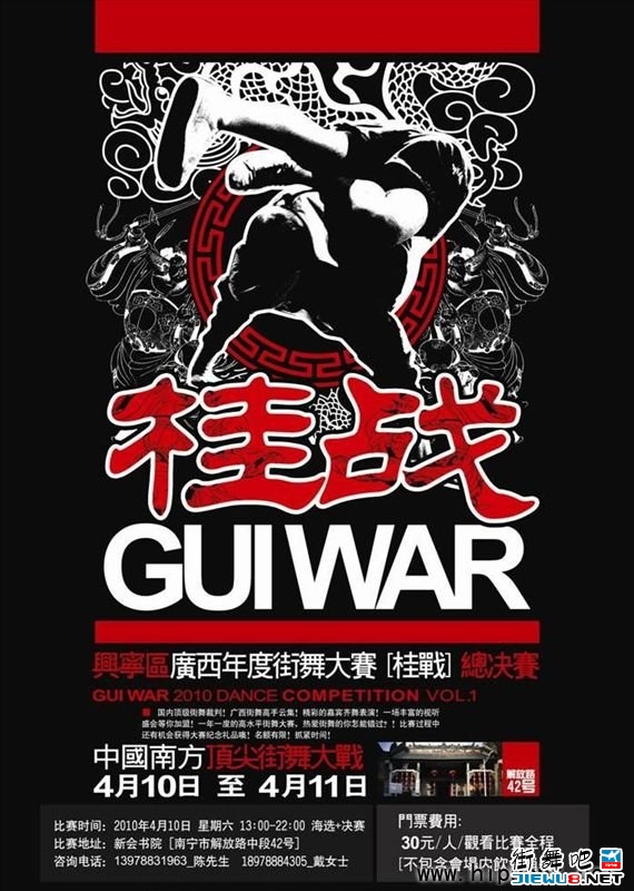 桂战——广西年度街舞大赛,以1 ON 1 BATTLE(斗舞)形式比赛,开设了FREE STYLE、POPPIN、BREAKING三个比赛项目,今年首次开设了南宁、北海、桂林三大分赛区,本站为桂战总决赛,各分赛区冠军以BATTLE GUEST(斗舞嘉宾)身份参加本次总决赛并直接进入32强。